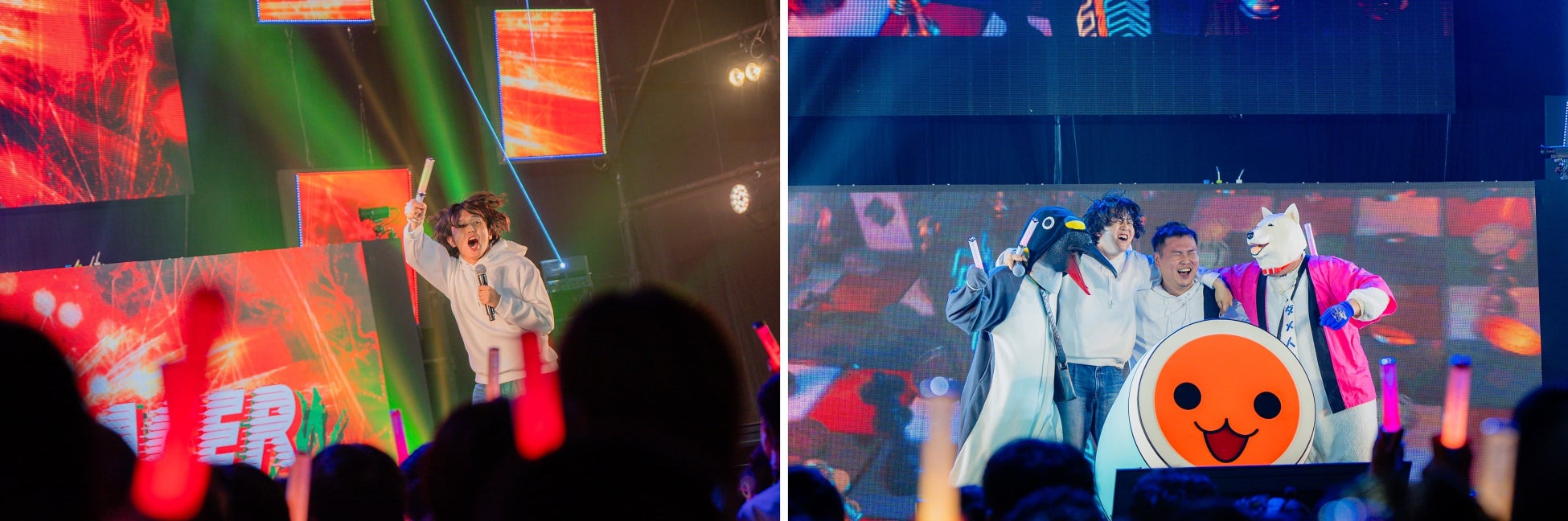 続くコラボパートでは、水野健治氏がDJを務め、『太鼓の達人』の「エンジェル ドリーム」「Hurtling Boys」を、はっぴー、チュウニペンギン、坪井リヒト氏、そしてどんちゃんとともに披露。退場時にはゆっくり歩くどんちゃんに再び「どんちゃん」コールが送られ、観客の温かい声援に包まれながらステージを後にしました。