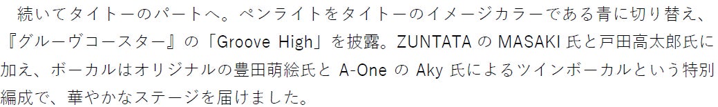 タイトーのステージは、『グルーヴコースター』シリーズの楽曲を中心に構成。まず、同シリーズのナビゲーターキャラクター・リンカ役の声優である豊田萌絵氏が登場し、「LINK LINK FEVER!!!」でライブがスタート。豊田氏による生歌唱に、観客は1曲目から大きな盛り上がりを見せました。その後、バトンを受けた魂音泉のらっぷびと氏が「まだまだ疲れてる場合じゃないぜ!」と呼びかけ、『グルーヴコースター』より「揺蕩うLove」「Arts in the Hearts」、そして「ゆけむり魂温泉II」を続けて披露しました。