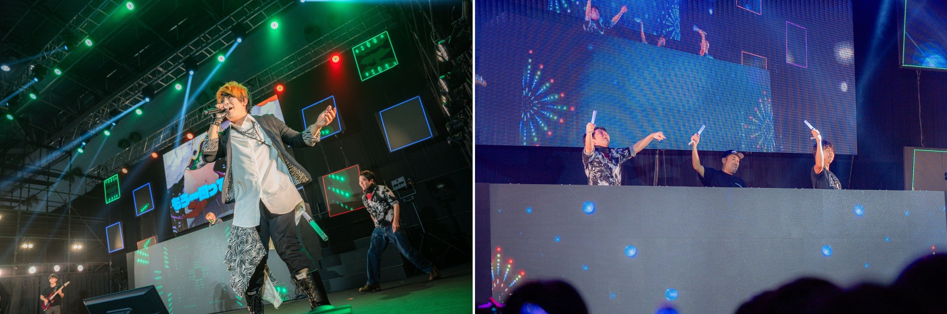 本編トップバッターを務めたコナミアーケードゲームスは、看板タイトルである『BEMANI』シリーズを中心としたセットリストを展開。サウンドクリエイター・Ryu☆氏の「ビッグサイト、もっと盛り上がっていくぞー!」という力強い声とともに、「MEGALOVANIA」でライブがスタート。Yvya氏の速弾きのギターサウンドと同曲が使用されたRPG『UNDERTALE』のサンズとの戦闘シーンが映し出されたLED画面に、会場のテンションは一気に上昇しました。続く「Bellatrix」(『GITADORA』)でもYvya氏は超絶テクで魅了。ハイスピードなギターリフを打ち込みではなく実際に演奏しているのを見られるのは、ライブならでは。Yvya氏の指の動きに観客は釘付けになりました。
