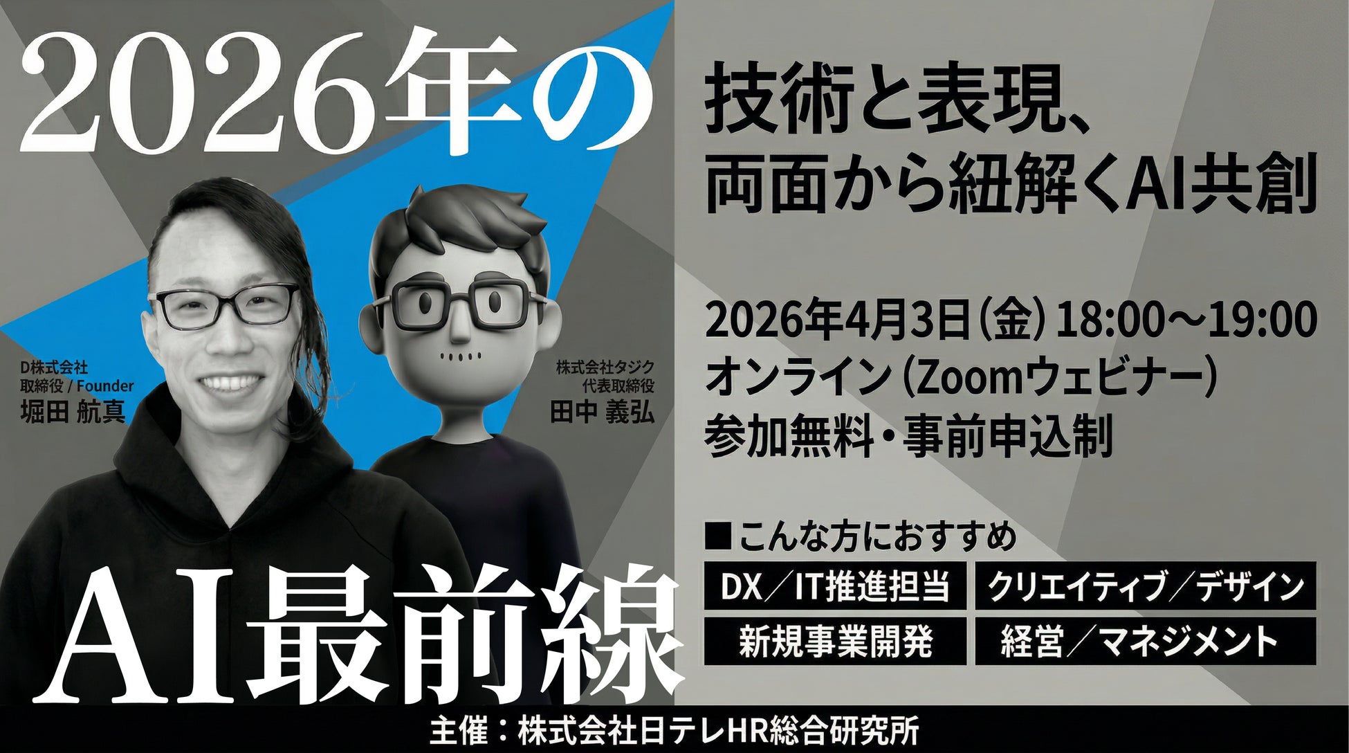 株式会社日テレHR総合研究所(本社:東京都港区、代表取締役:中村博行、以下、日テレHR)は、2026年4月3日(金)18:00より、オンラインウェビナー「2026年のAI最前線:技術と表現、両面から紐解くAI共創」を開催いたします。本ウェビナーでは、AIの社会実装を推進する技術領域のスペシャリストと、AIによる新たな表現を切り拓くクリエイティブ領域の専門家が登壇。マルチモーダルAIや自律型AIエージェントの最新事例から、AIクリエイティブによる表現の変化まで、技術と感性の両側面から「AI活用の最前線」を紐解きます。