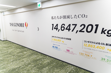 壁面には、これまでのCO₂削減量やリサイクル実績を「数字のデザイン」で可視化。