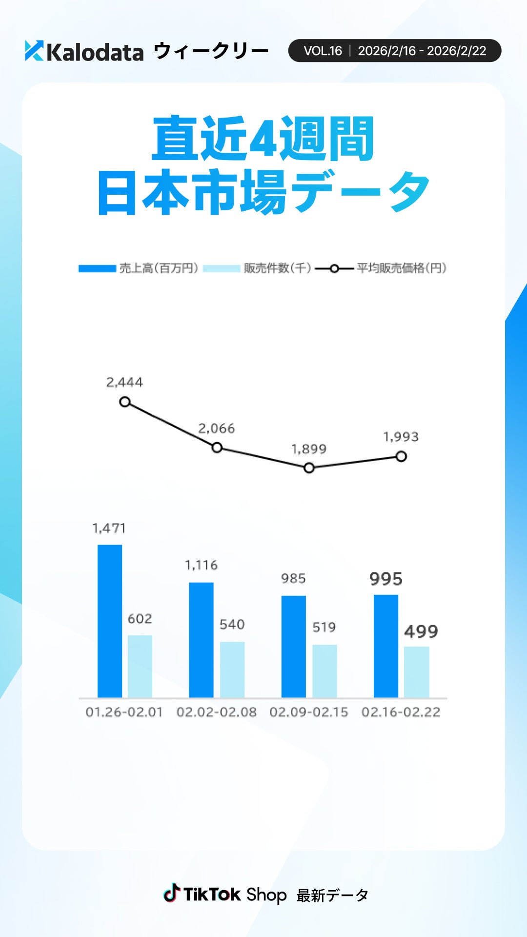Kalodata Japan(運営:株式会社Kalowave Japan)の最新データによると、2月16日〜2月22日の日本TikTok Shop市場はGMV9.95億円(前週比+1%)と横ばいで推移しました。主要事業者の稼働低下や配送遅延への懸念から販売件数は減少しましたが、平均販売単価は上昇し、高単価商品の伸びが市場規模を維持する結果となりました。