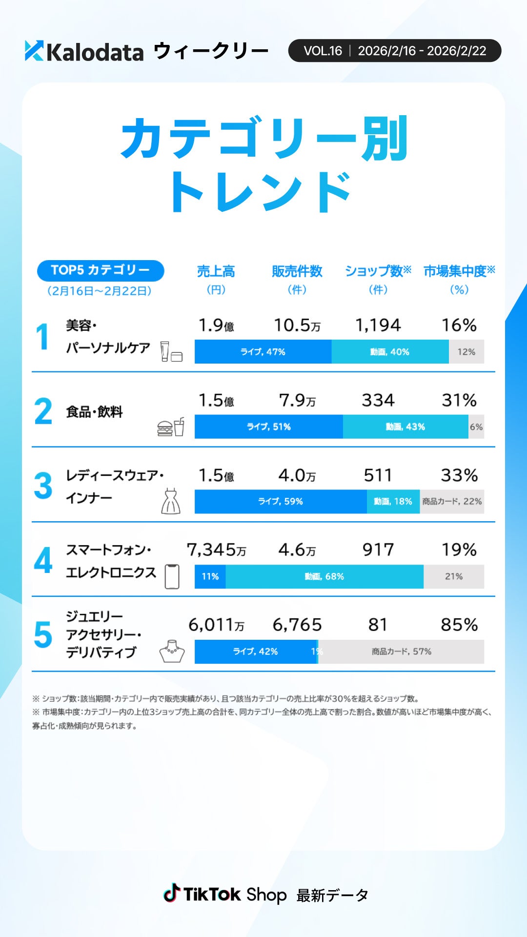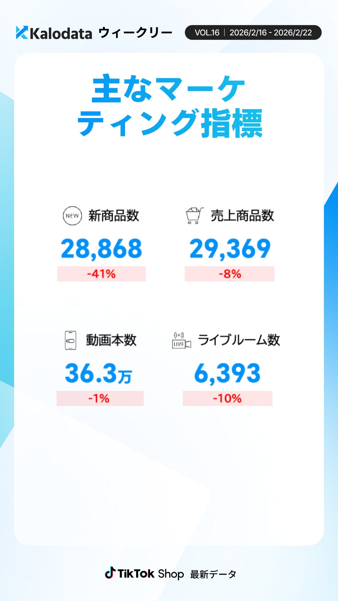 【Kalodataウィークリー】TikTok Shop日本、GMV9.95億円 件数減少も単価上昇で市場規模を維持(2026年2月16日週)