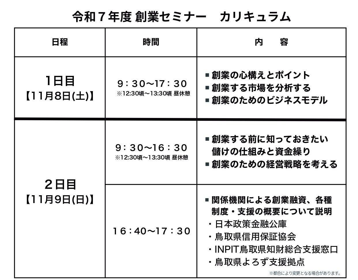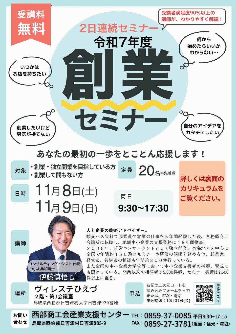 鳥取県商工会連合会 西部商工会産業支援センターは、11月8日(土)・9日(日)の2日間 創業セミナーを開催します。