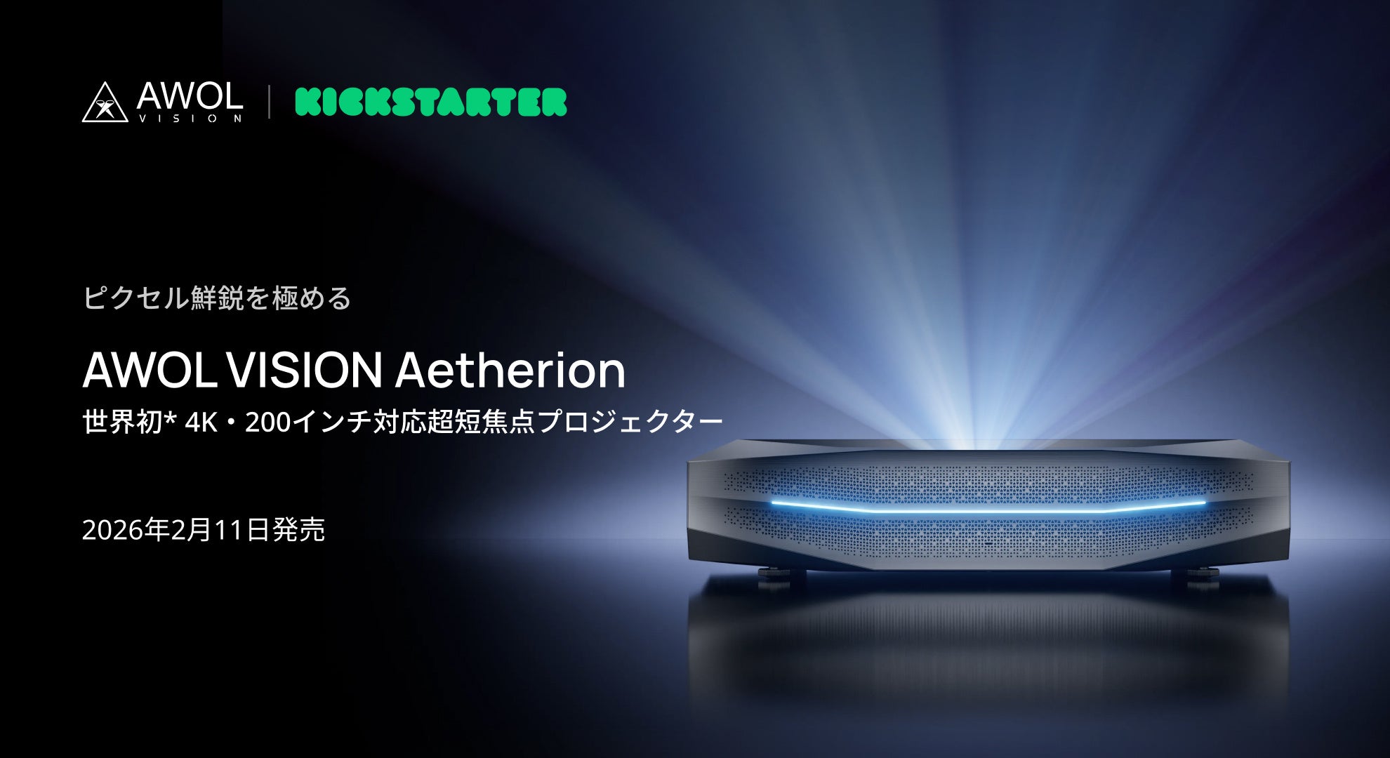 AWOL Vision(本社:米国フロリダ州、代表取締役:Andy Zhao)は、CES 2026で初公開した注目のプロジェクターシリーズ「Aetherion」について、2026年2月11日よりKickstarterにて予約受付を開始することを発表しました。早期支援者は、世界最高水準の鮮鋭度を誇ると評価されている4Kトリプルレーザー超短焦点(UST)プロジェクターを、最大2,300米ドル(約32万2,000円※1)の割引価格で購入することが可能です。