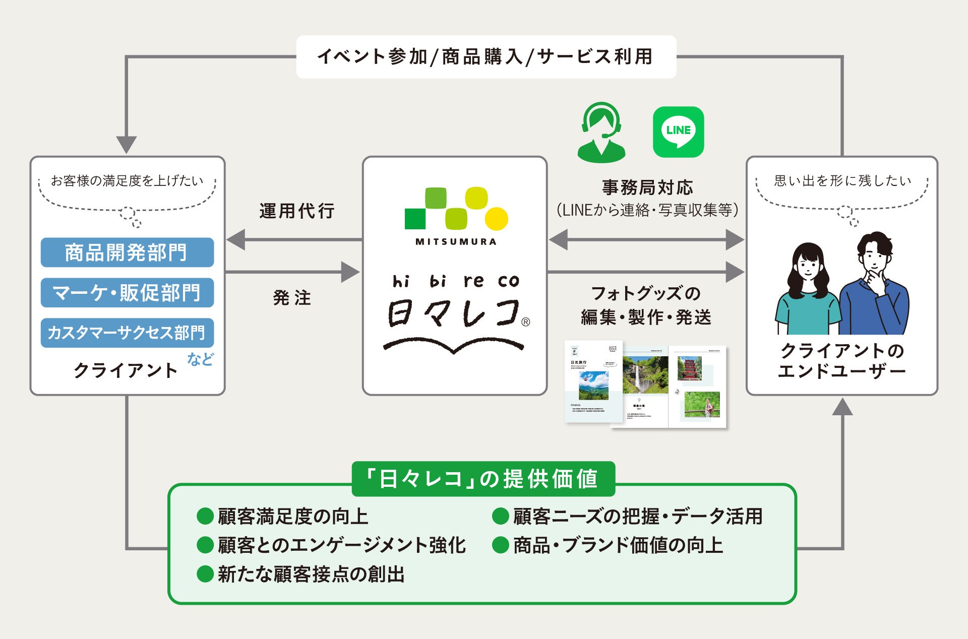 「日々レコ®」は、B(光村印刷)to B(クライアント企業様)to C(エンドユーザー様)のモデルで提供するソリューションです。