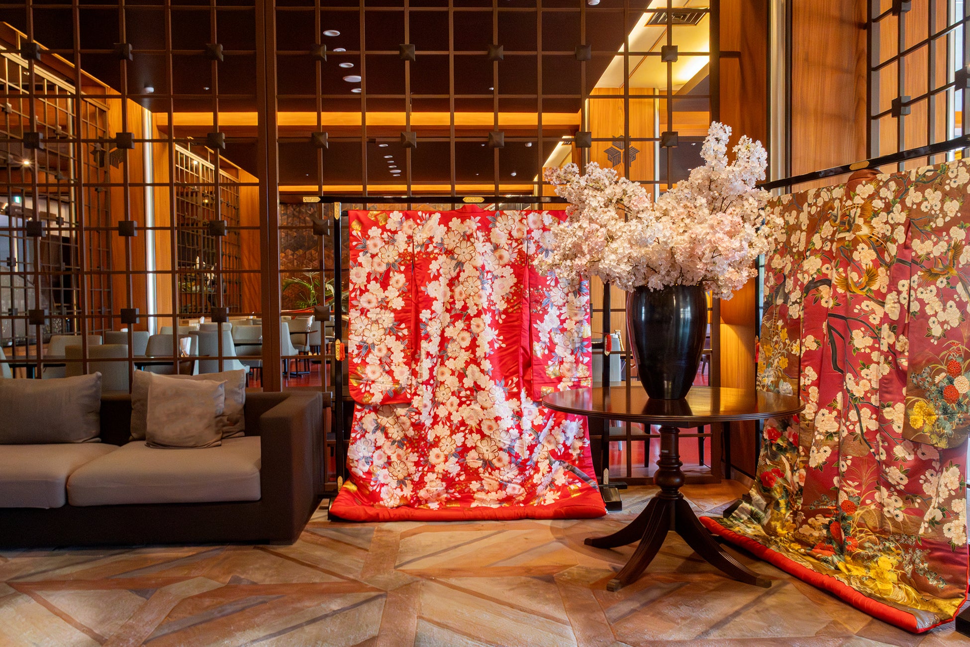 岡山国際ホテルでは、敷地内の随所で花開く木々に春を感じていただけます。さらに期間限定で、エントランスロビーには桜のモチーフがより一層華やかな美しさを醸し出す絢爛豪華な色打掛と装花のフォトスポットが登場します。