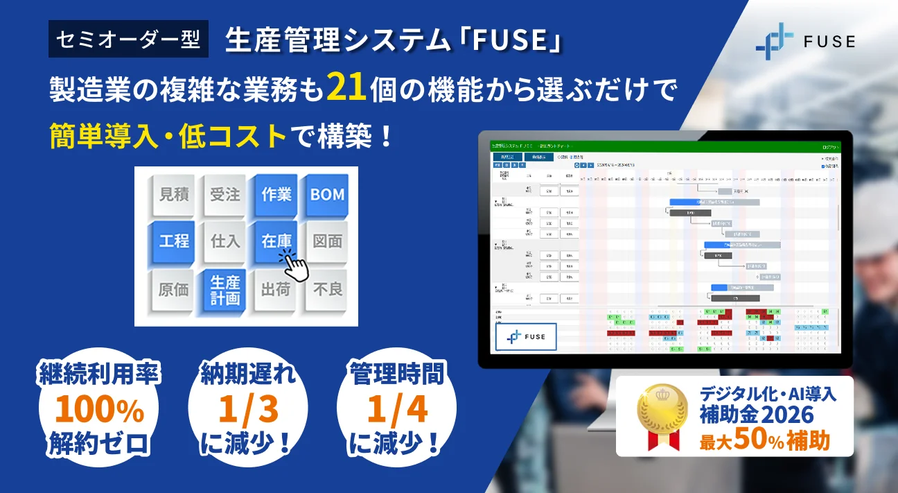 FUSEは、中小製造業向けに特化したセミオーダー型生産管理システムで、必要な機能だけを選択しながら段階的に導入できる点や、現場への定着を支えるサポート体制を特長としています。