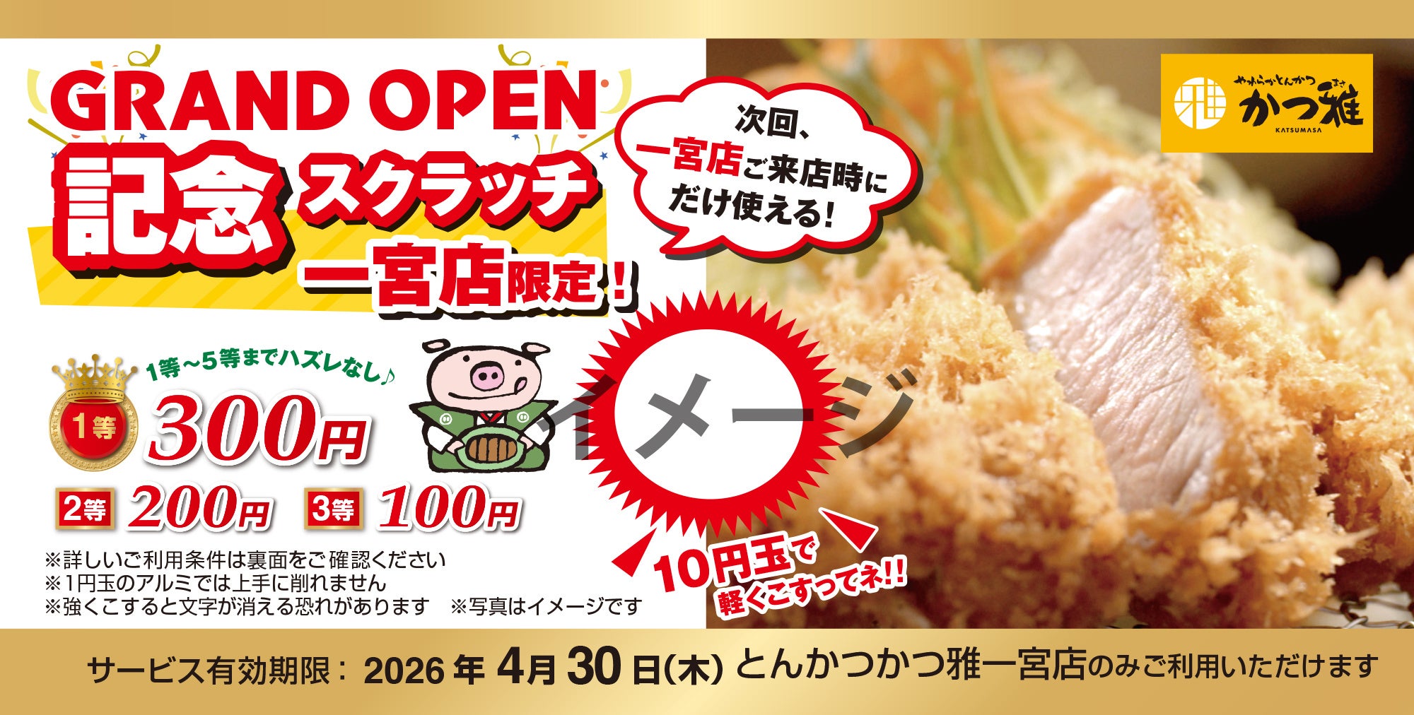※お食事された人数分のスクラッチ券を配布いたします。 ※スクラッチ券の有効期限は2026年4月30日(木)までです。 ※かつ雅一宮店限定で使えるスクラッチ券です。