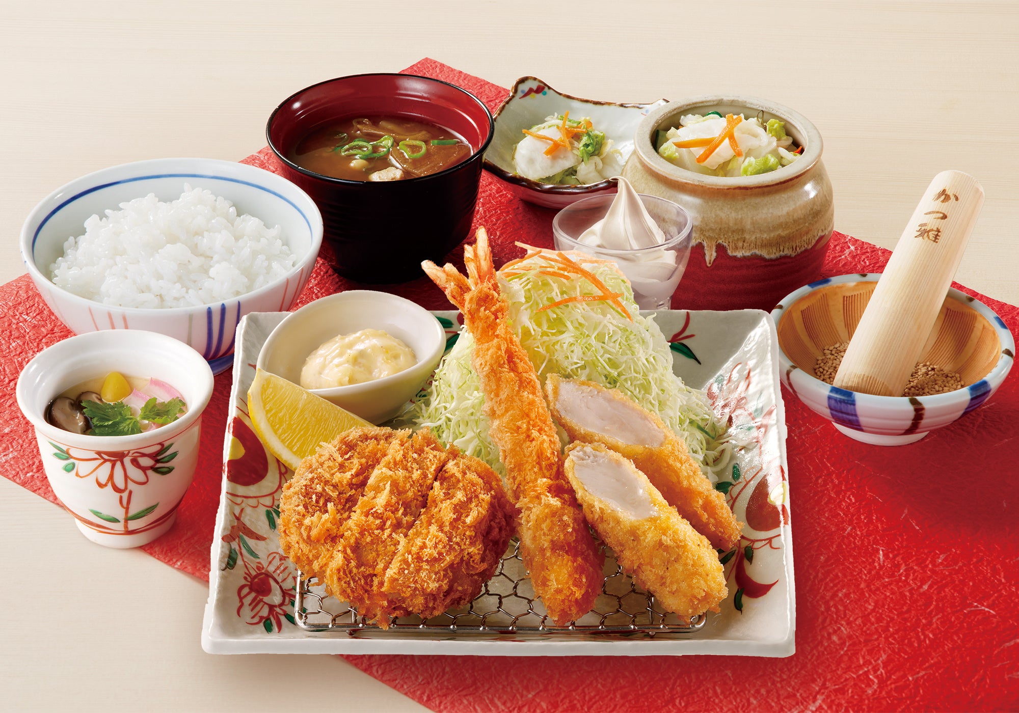 ヒレかつ(80g)、ささみかつ(1本)、海老フライ(1本)が楽しめるかつ雅の看板メニュー。茶碗蒸しとデザート(ソフトクリームor胡麻団子)も付いた豪華なメニューです。もちろん、ごはん・味噌汁・キャベツ・お漬物はお替り自由。