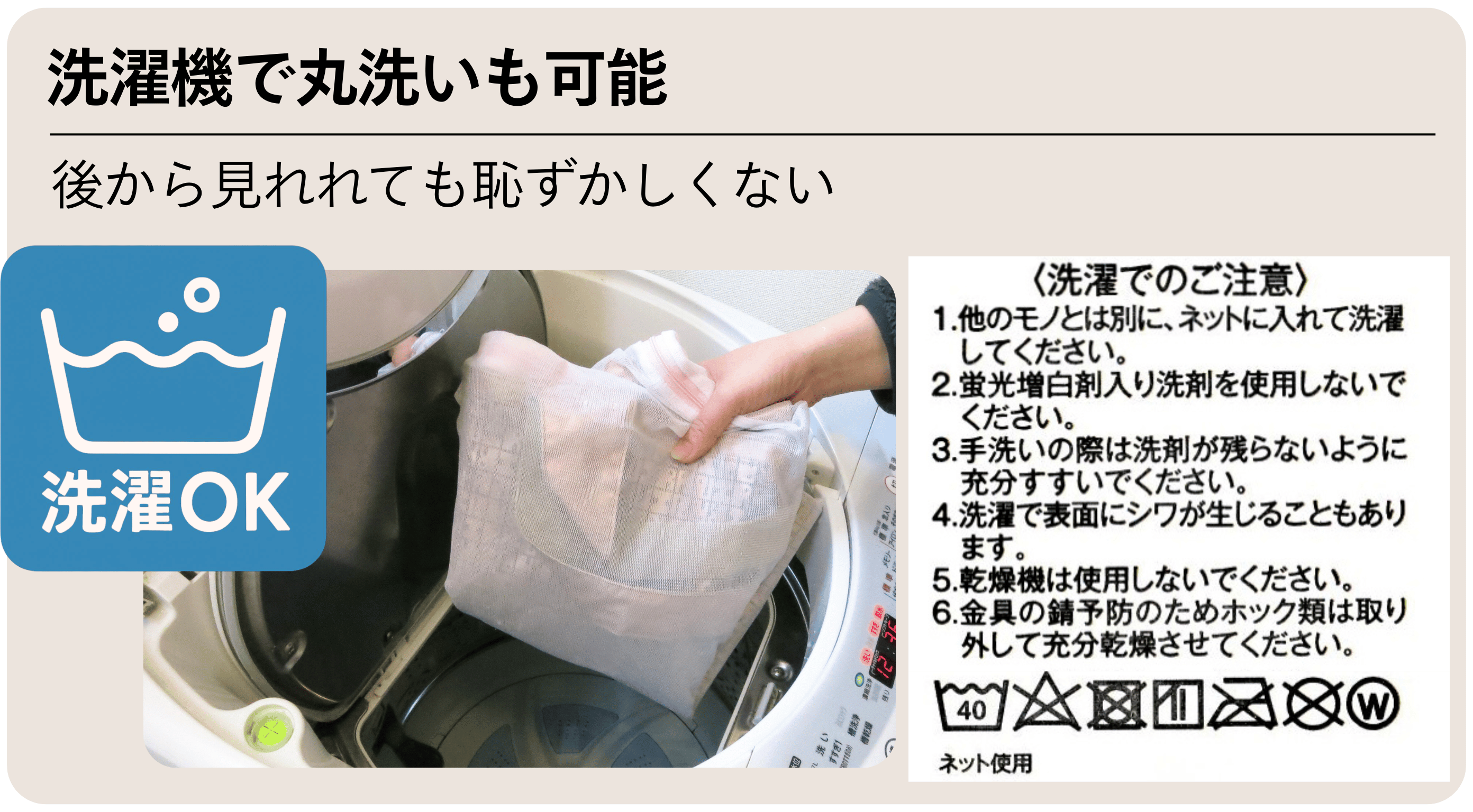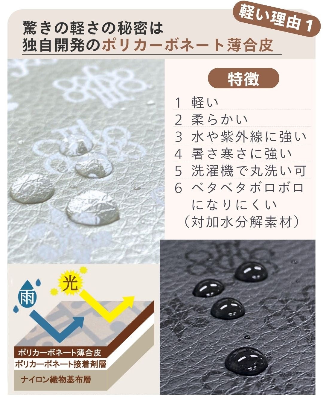 「ウレタン合皮」は劣化しやすく、洗えない」という常識を打破。水や紫外線に強く、驚くほど軽いのに丈夫な独自素材『ポリカーボネート薄合皮』を独自開発しました。さらに、家庭用洗濯機での丸洗いが可能。軽く柔らかなウレタンの特性を活かしつつ、経年劣化によるべたつきや剥がれの悩みを解決しました。