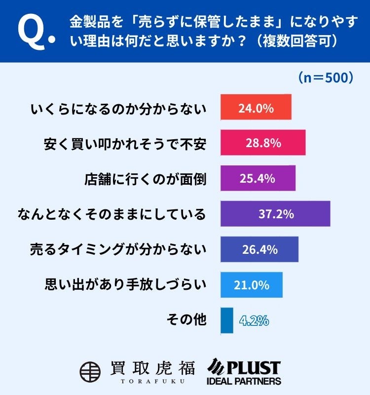 金製品を売らずに保管したままになりやすい理由について尋ねたところ、最多は「なんとなくそのままにしている」(37.2%)でした。