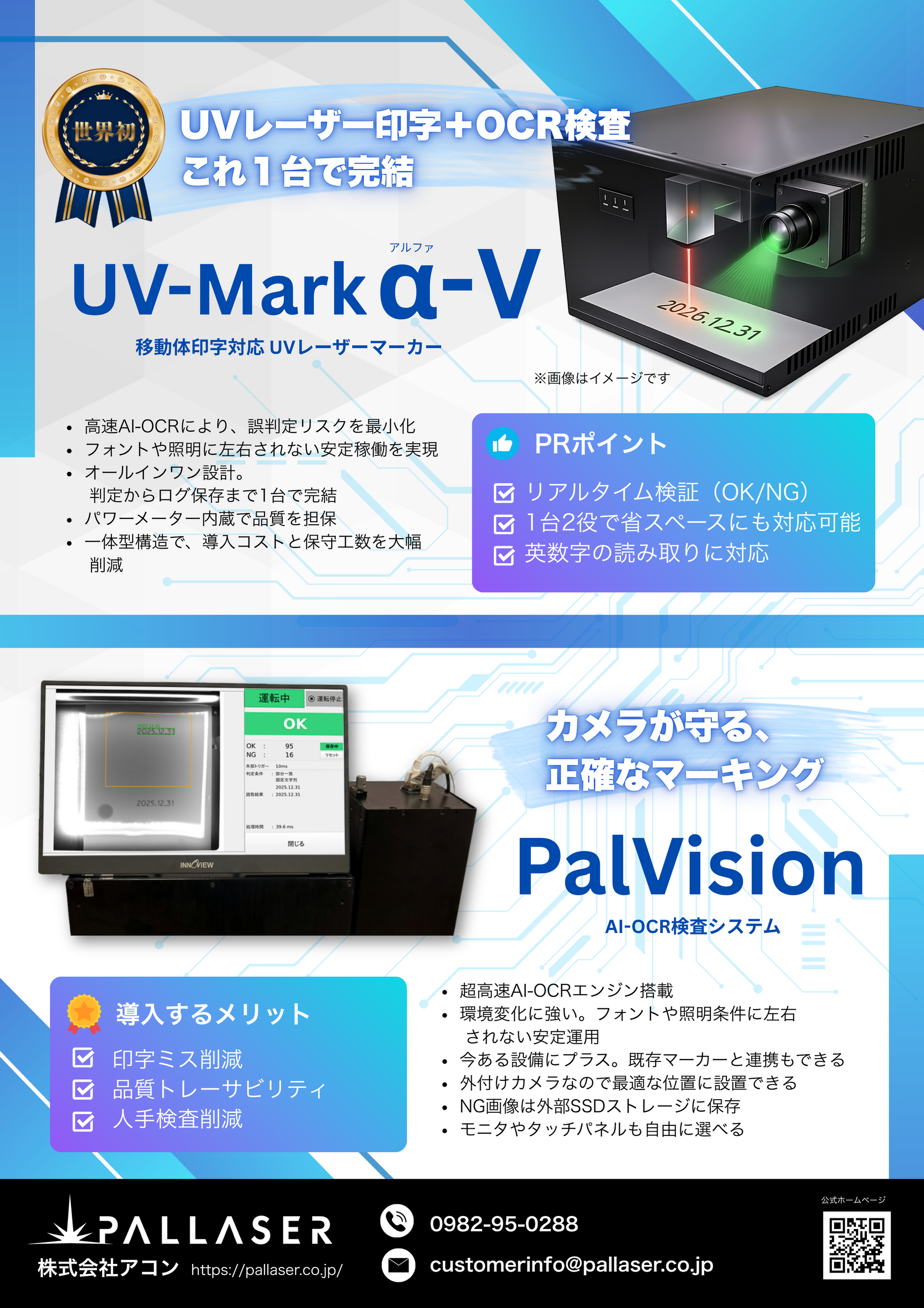 株式会社アコン(本社:宮崎県日向市、代表取締役:小森田 善久)は、移動体への安定した印字と確実な検査を両立するUVレーザーマーカーを近日リリース予定です。