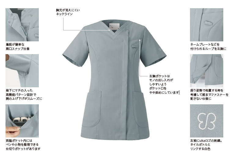 住商モンブランが積み重ねてきたパターン研究と現場の声から生まれたデザインで、より美しく動きやすくスタイルアップできるシルエットのレディススクラブです。
