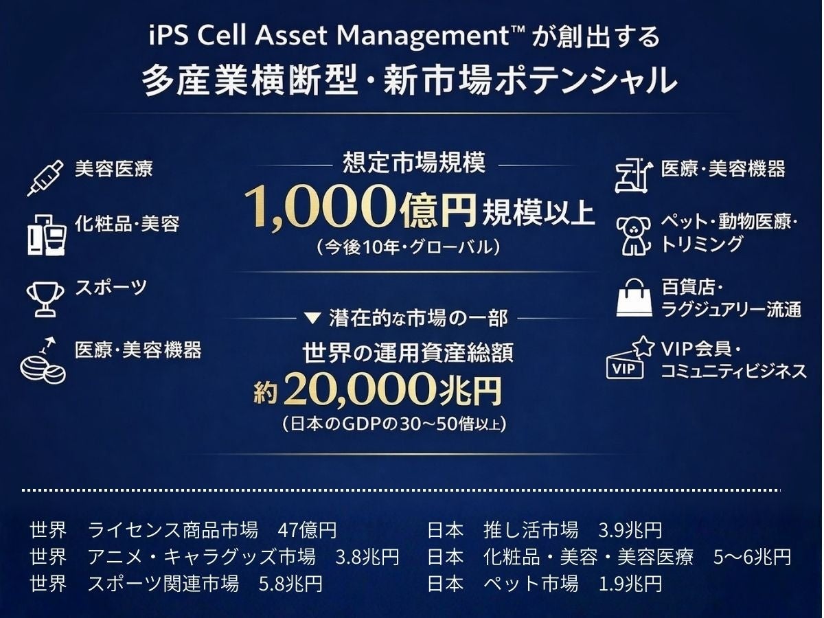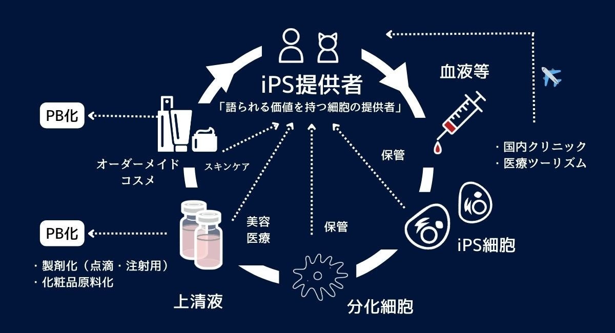 本構想に基づき、当社は芸能人・著名人・トップアスリートなどの個人に由来するiPS細胞を「再生可能資産(細胞由来資産)」として管理・活用し、プライベートブランド(PB)商品へと展開する取り組みを、世界に先駆けて推進してまいります。著名人由来iPS細胞の作製はすでにICEにて進行しており、化粧品をはじめとする多領域での事業化を見据えています。今後は日本国内にとどまらず、世界中の有名人・著名人を対象としたグローバル展開を視野に入れるとともに、先進医療・再生医療を求めて来日する海外富裕層・医療ツーリズム市場を強力に巻き込みながら、本構想を国際的な新産業へと拡大してまいります。