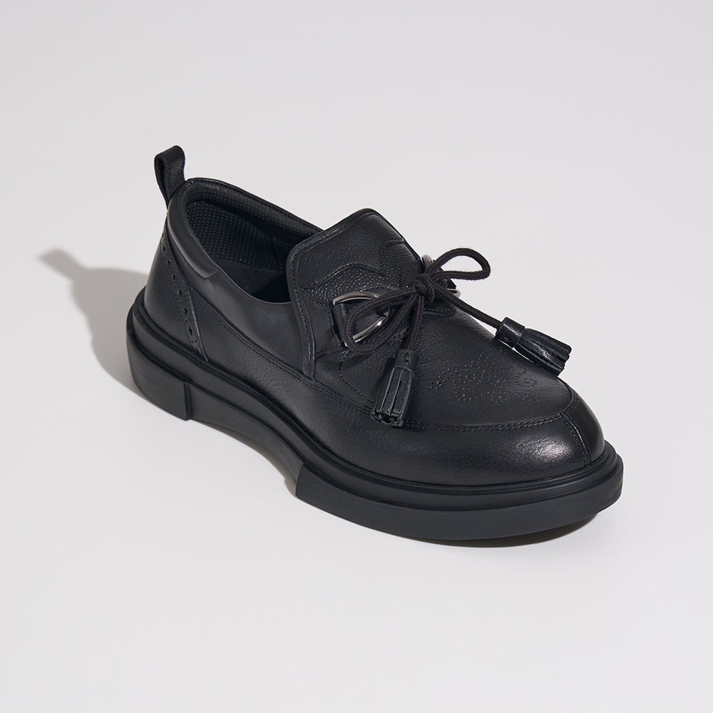 コインローファーとDリングローファー、二つの伝統的意匠を融合し、現代的に再構築。クラシックとモダンが交差する、新しいローファースニーカーです。Dリングやタッセルディテールにより機能性と装飾性を両立。菱形の穴飾りやコインスリットなど、細部に至るまで独自のデザインを追求しています。さらに、踵部分にクッションを内蔵し、ローファー特有のフィット感の課題を解消。見た目のクラシックさと、現代的な履き心地を両立しています。