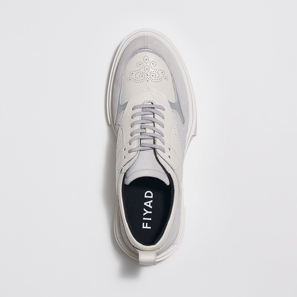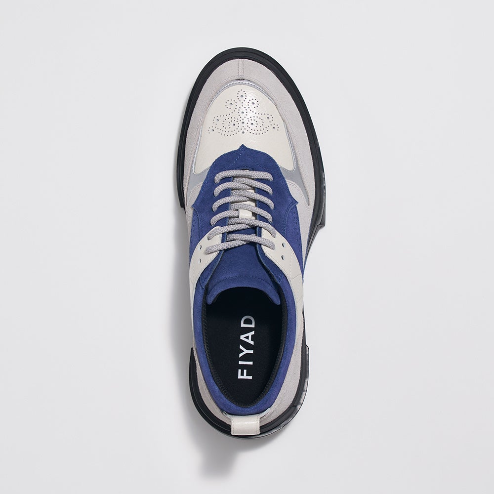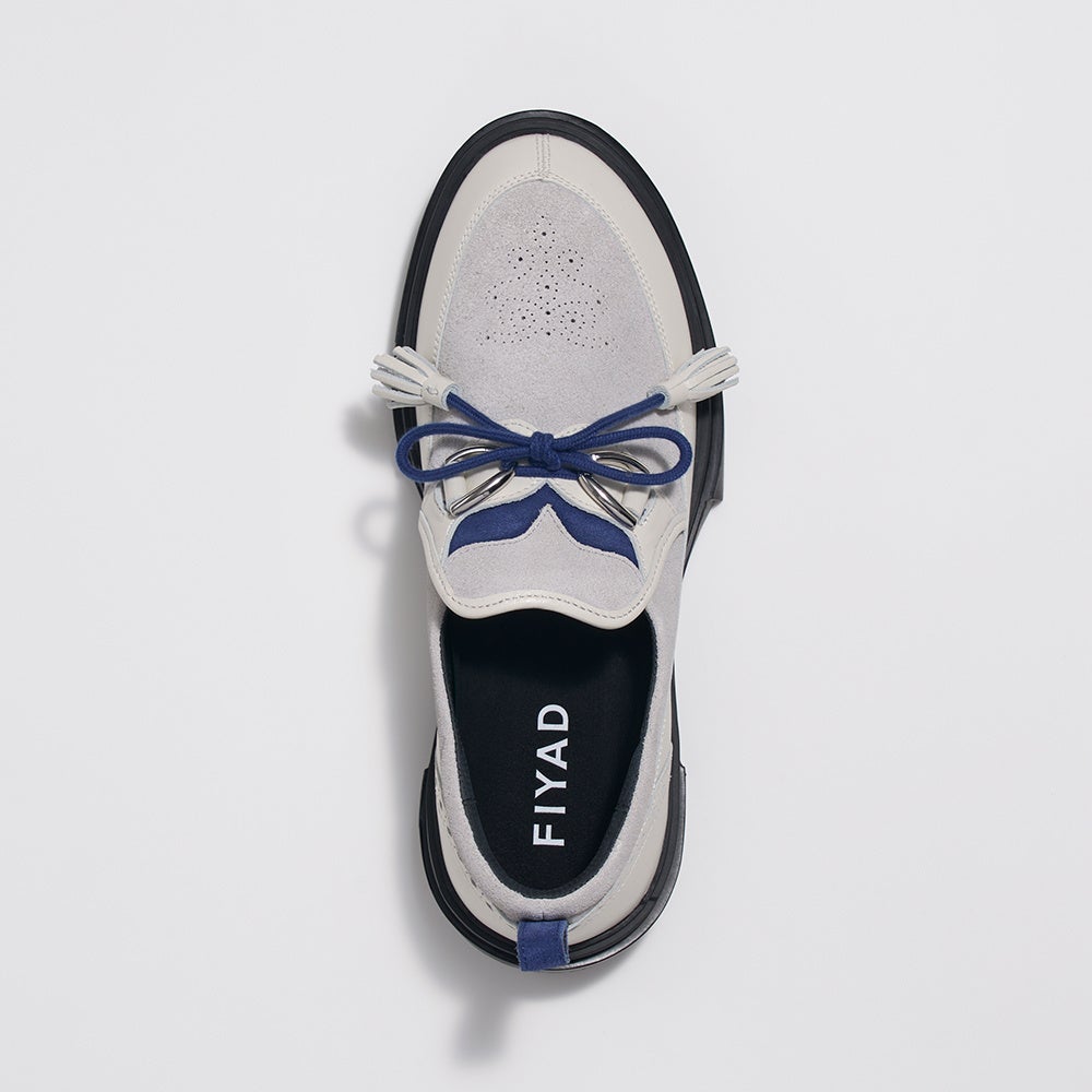 80〜90年代のアウトドア・スポーツシーンに見られた“クレイジーカラー”から着想。大胆な配色のエネルギーを継承しながらも、ノイズ感を抑え、大人が履けるエレガントな表現へ再構築しました。革靴の造形美を基盤に、柔らかな曲線と鋭い直線を組み合わせ、鮮やかな色彩でありながら落ち着いた佇まいを実現。さらに、リフレクターシューレースやプル・ストラップ、バスケットシューズ由来の補強パーツなど、スニーカーの要素を随所に取り入れています。単色モデルにおいてもレイヤー構造で奥行きを生み出し、色に頼らない存在感を表現。遊び心と品格を両立した、FIYADを象徴する一足です。