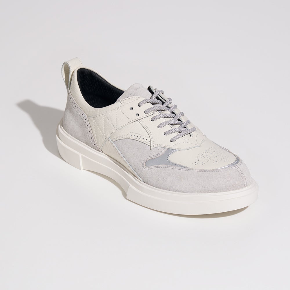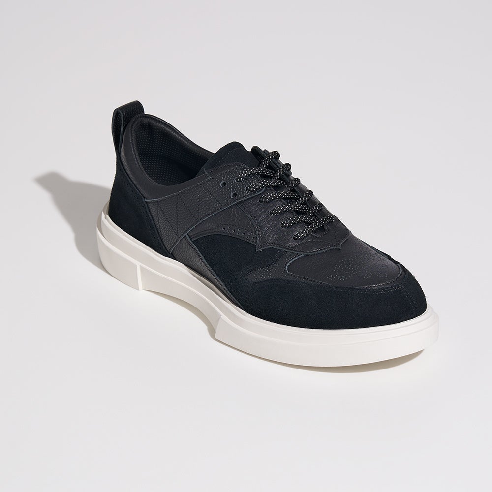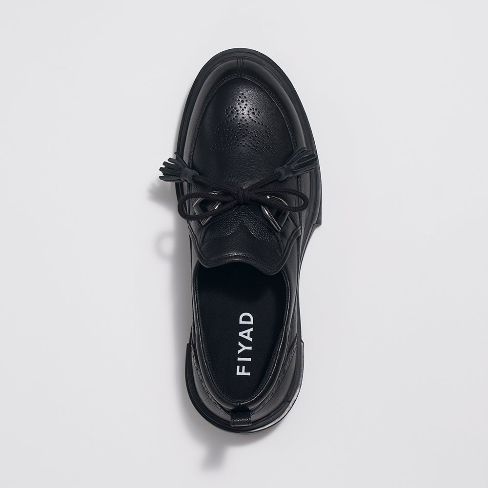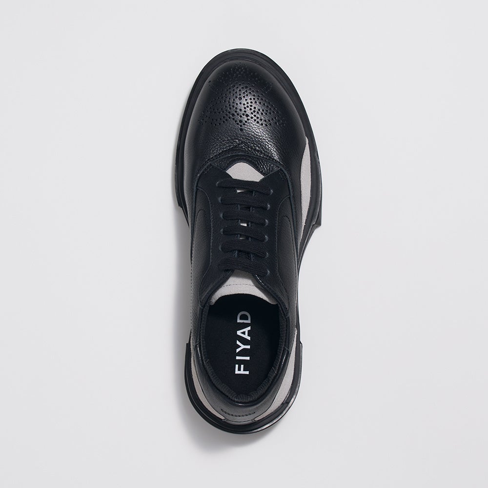 80〜90年代のアウトドア・スポーツシーンに見られた“クレイジーカラー”から着想。大胆な配色のエネルギーを継承しながらも、ノイズ感を抑え、大人が履けるエレガントな表現へ再構築しました。革靴の造形美を基盤に、柔らかな曲線と鋭い直線を組み合わせ、鮮やかな色彩でありながら落ち着いた佇まいを実現。さらに、リフレクターシューレースやプル・ストラップ、バスケットシューズ由来の補強パーツなど、スニーカーの要素を随所に取り入れています。単色モデルにおいてもレイヤー構造で奥行きを生み出し、色に頼らない存在感を表現。遊び心と品格を両立した、FIYADを象徴する一足です。