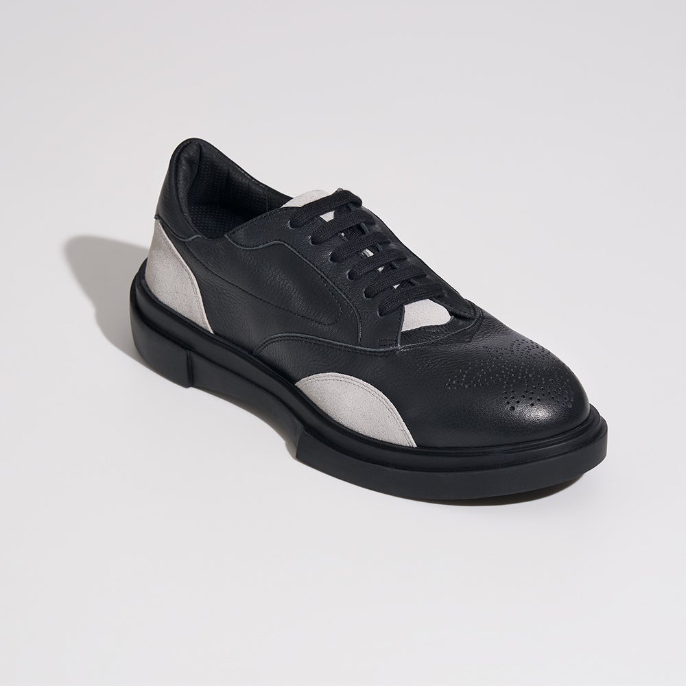 スケーターが好む要素を残しながら、“大人のスケーターシューズ”として再構築。あえて実用性を削ぎ落とし、ファッションとしての存在感を意識して設計された一足。内外で異なるデザインを持つ非対称構造により、見る角度によって表情が変化。カジュアルとドレッシーの狭間をしなやかに横断します。
