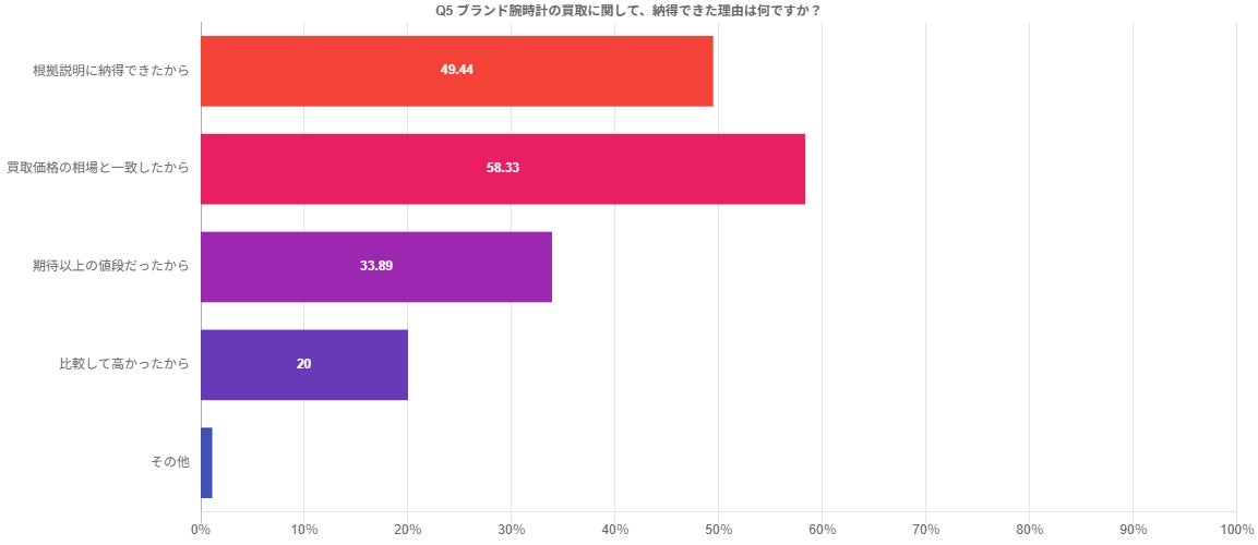 一方、納得できなかった理由では、「期待していた値段より安かったから」55%が最多となり、次いで「買取価格の相場より安かったから」25%、「他社と比較して安かったから」25%、「根拠説明に納得できなかった」5%という結果でした。