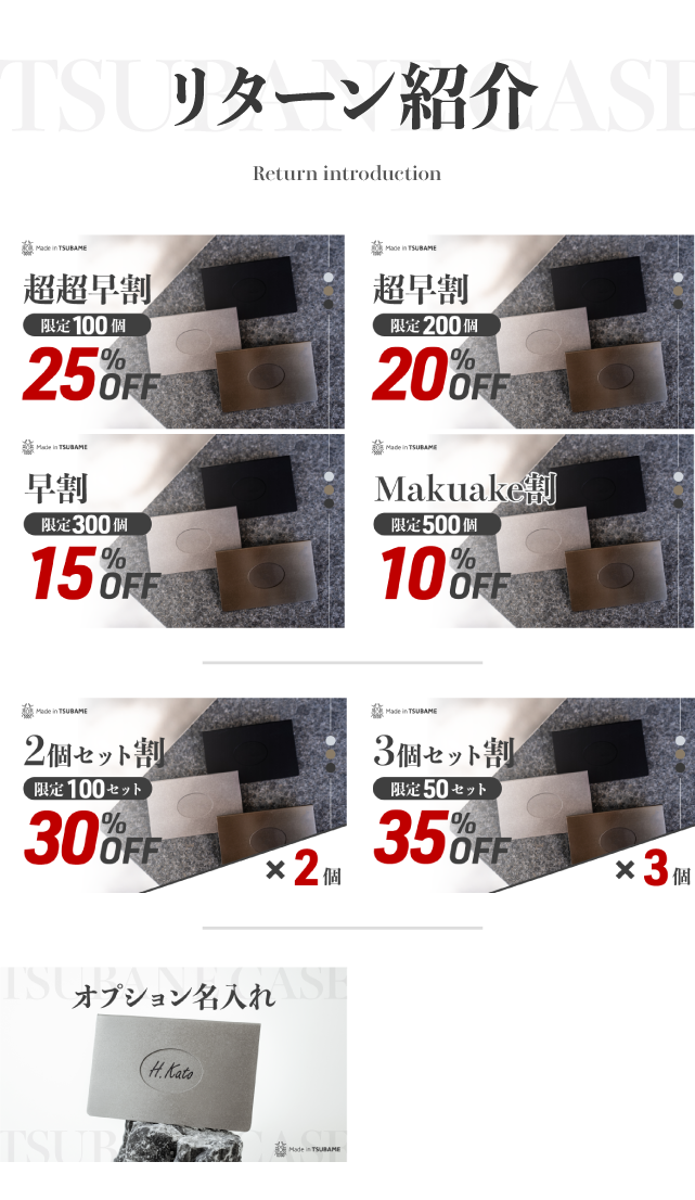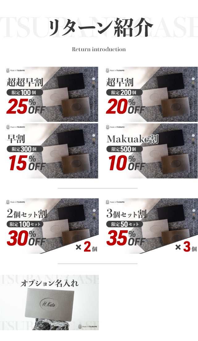 支援者には、最大35%OFFや選べるカラー、名入れオプションなどの特典がつくリターンがございます。
