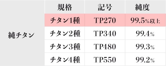 宇宙航空分野、医療分野で活躍している国産の純チタン1種を採用。チタンの中でも最も純度が高く軽量、高強度、耐食性に優れています。