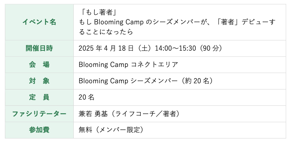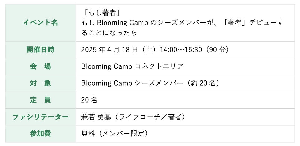 2026年4月5日に商業出版デビューを果たした著者本人が直接ファシリテートする、Blooming Campならではの特別な機会です。