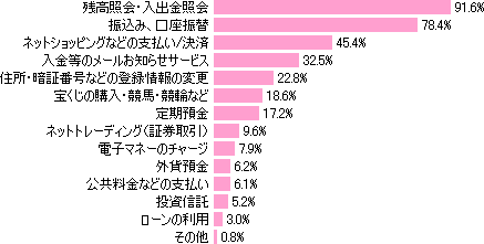 「残高照会・入出金照会」が91.6%で最も多く、次いで