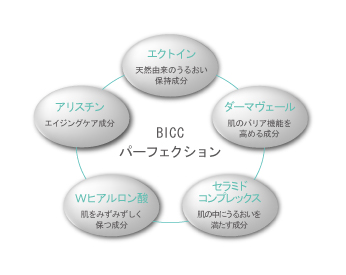 BICC理論とは、BICCパーフェクションというダイアナオリジナルのバランス処方で生まれた、新しい美肌づくりのための優れた成分構成を用いた理論です。ディアナージュ アレスに含まれる有用成分とは、天然由来のうるおい成分「エクトイン」、エイジングケア成分「アリスチン」、肌をみずみずしく保つ成分「Wヒアルロン酸」、肌の中にうるおいを満たす成分「セラミドコンプレックス」、肌のバリア機能を高める「ダーマヴェール」の5つです。この5つの有用成分それぞれが持つ機能を補完しあうことで、相乗効果を引き出します。肌本来の力を導き出すために、表皮ケアを中心に肌バランスを整えることで、うるおいとみずみずしさに満ちた理想の肌を持続します。