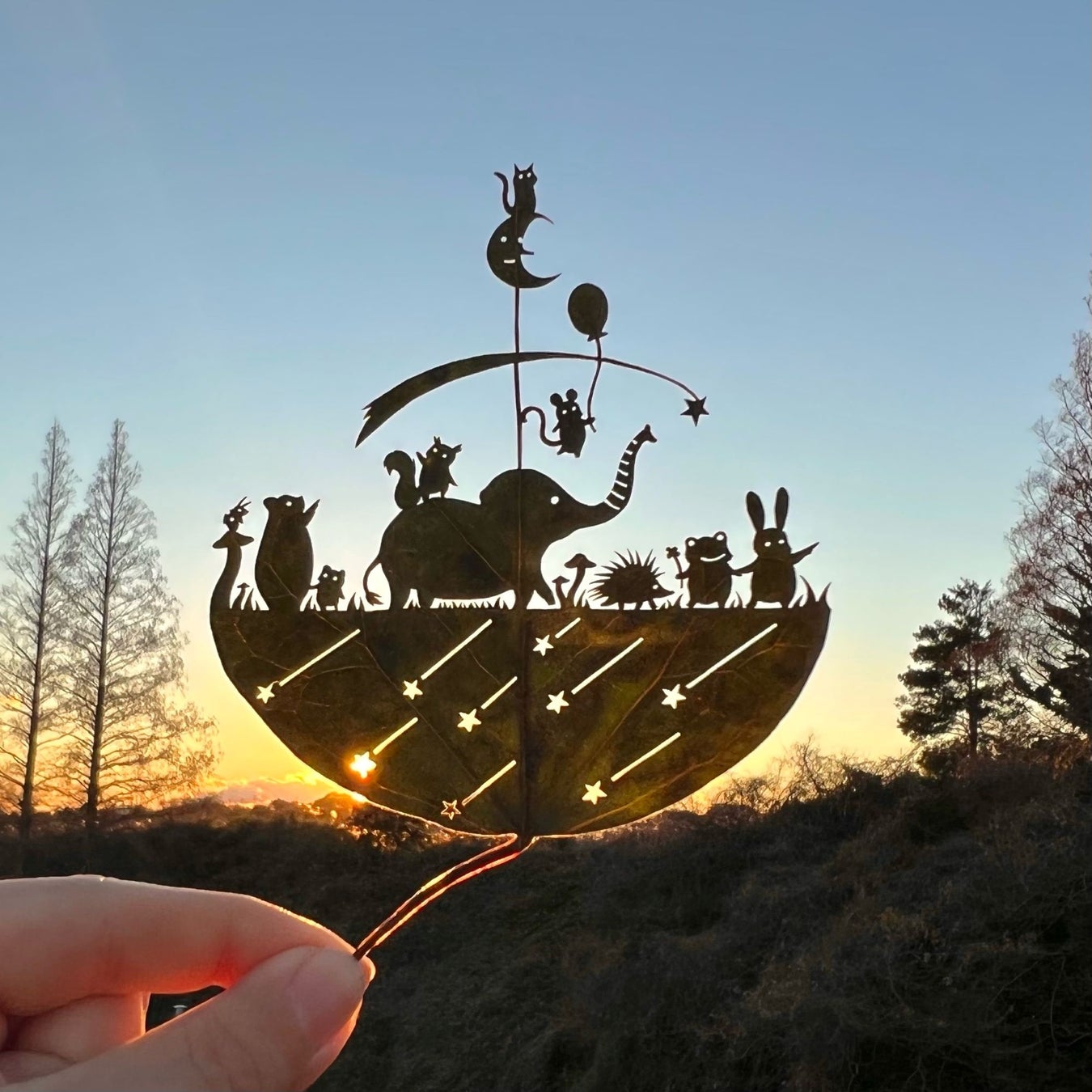 わずか数センチの葉っぱの上に、動物や人の姿、物語を刻む「葉っぱ切り絵」。