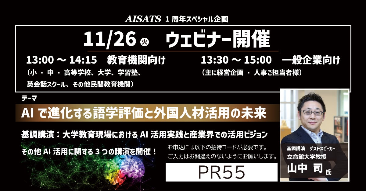 当ウェビナーでは、基調講演として、AIによる語学習得に精通した立命館大学教授 山中司氏にご登壇いただき、「大学教育現場におけるAI活用実践と産業界での活用ビジョン」をテーマにお話いただきます。その他、学校・民間教育・企業での語学評価AI「AISATS(アイサッツ)」活用事例、日本語教育と外国人材雇用現場における活用ビジョン等、複数の講演を行います。