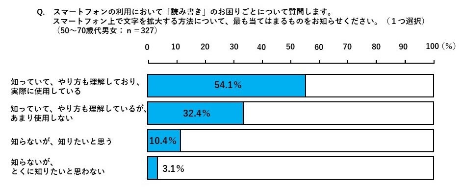 結果は86.5%が「知っていて、やり方も理解している」と回答している。しかし、3割以上のシニア(32.4%)はその機能を使っていない。やはり、デフォルトで文字を大きくして読みやすくする必要がある。