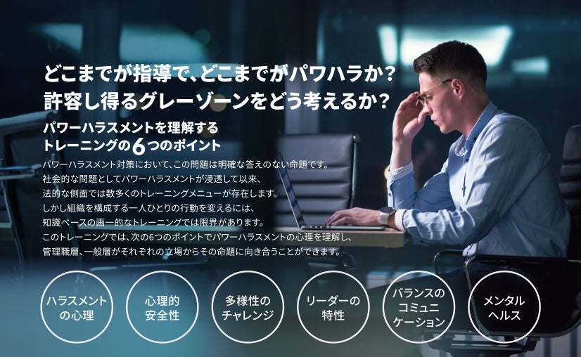 「Videoエクササイズ パワハラ防止アドバンス」は簡単・低価格で社内研修を実施できる、お得な動画パッケージです。従来型の法令知識ベースではない、コンプライアンス研修コンテンツ(多様性、心理的安全性、組織行動学からのアプローチ)で、パワーハラスメント問題を解決に導きます。買い切り型の研修動画は、場所や時間を選ぶことなく、毎年の社内研修に活用出来ます。