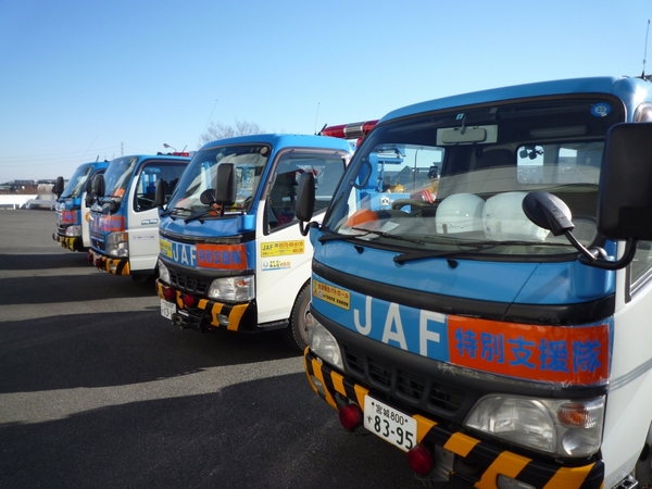 なお、東日本大震災により被災したエリア(おもに被害の大きい宮城県・岩手県)に全国から「JAFロードサービス特別支援隊」を派遣し、自治体等の災害対策本部等の要請に応じて被災して動けなくなった車両を移動する作業を行っています。被災地における皆様の安全な移動手段の確保に取り組んでいます。