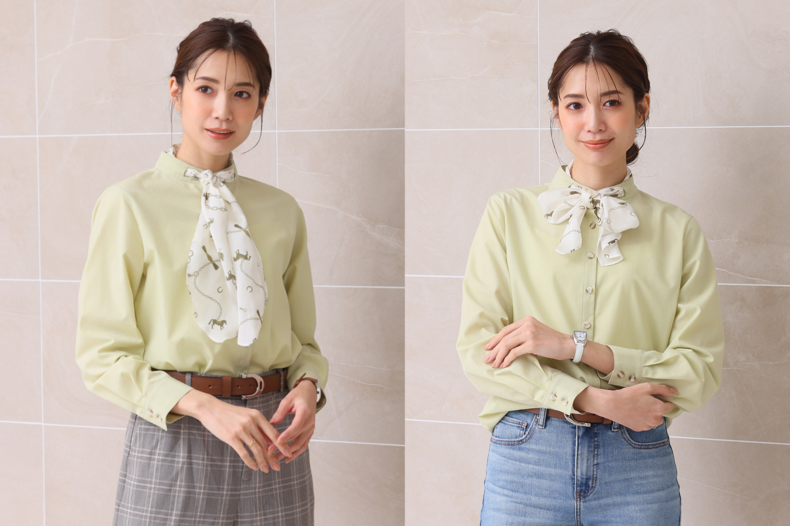 春色にときめく馬好きのためのホースモチーフスカーフ付きシャツブラウスは、ピスタチオグリーン、ペールブルー、グレージュの3色展開。スカーフはオリジナルの馬や馬蹄などの柄がプリントされています。