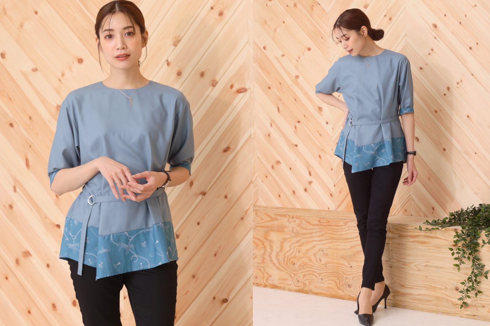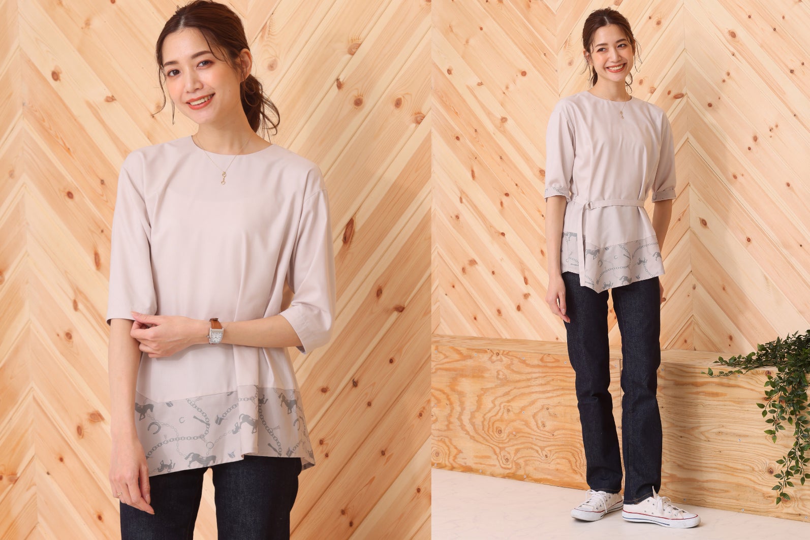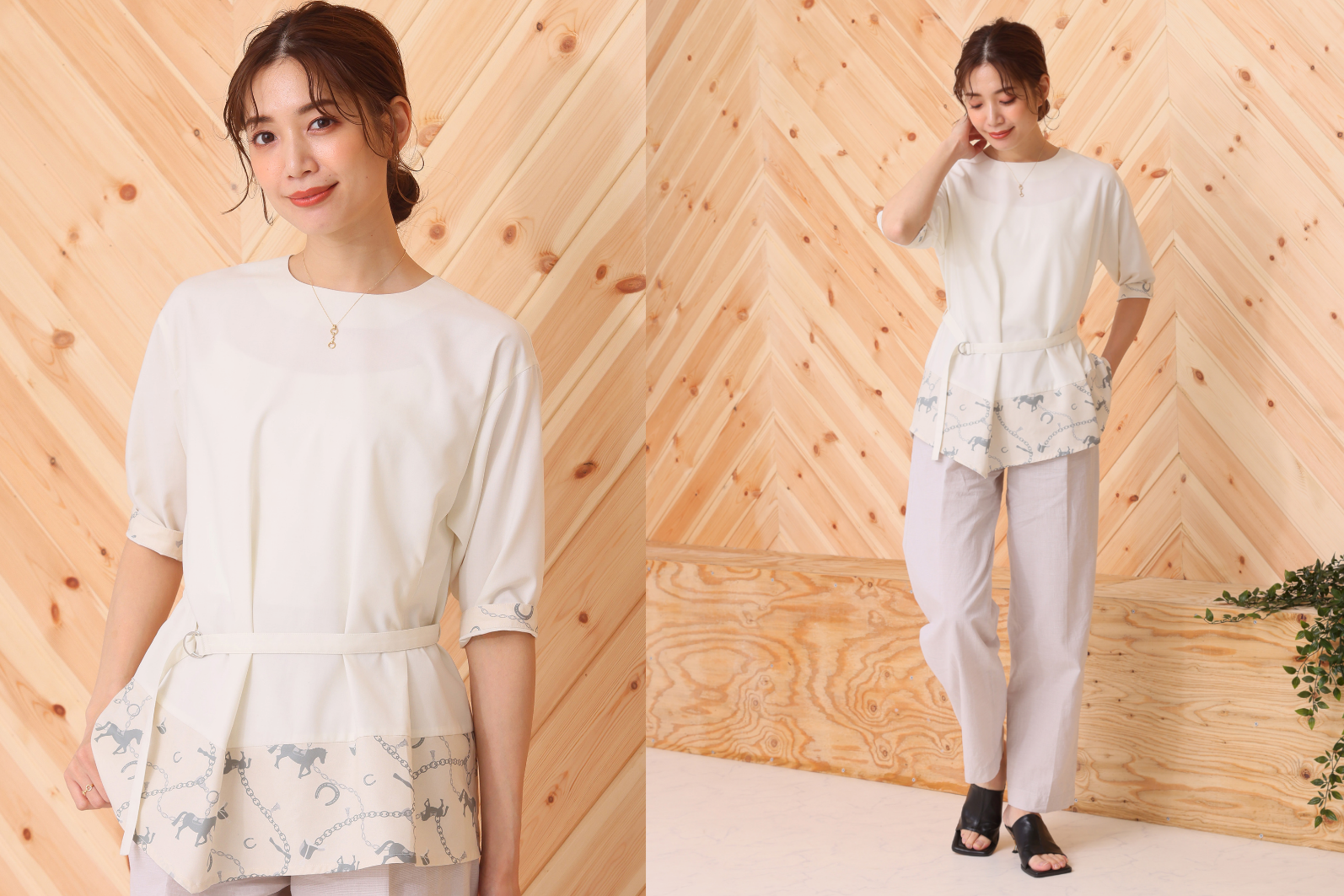 乗馬ファッションだけではなく馬をテーマにしたライフスタイルを提案する、そんな思いを形にすべく2アイテムを開発いたしました。「おしゃれをして街に出かけて買い物やカフェタイムを楽しみたい時に着たくなる」をコンセプトに、馬や馬蹄などの柄がプリントされたスカーフ付きのブラウスと、裾と袖口に同柄の切り替えが施されたプルオーバーをデザインいたしました。どちらもコーディネートによって全く違う雰囲気に仕上がる1枚なので、普段着に、オフィスカジュアルに、ちょっとしたお出かけにとシーンを選ばず着ていただけます。