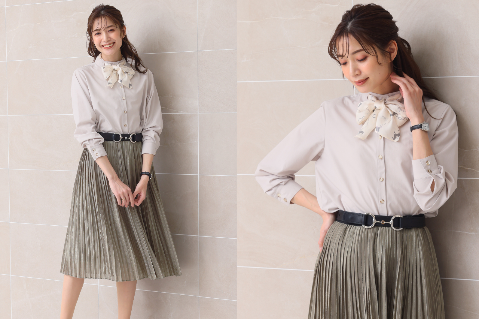 カラー:グレージュ クールなグレージュにプリーツスカートを合わせて大人ガーリーに