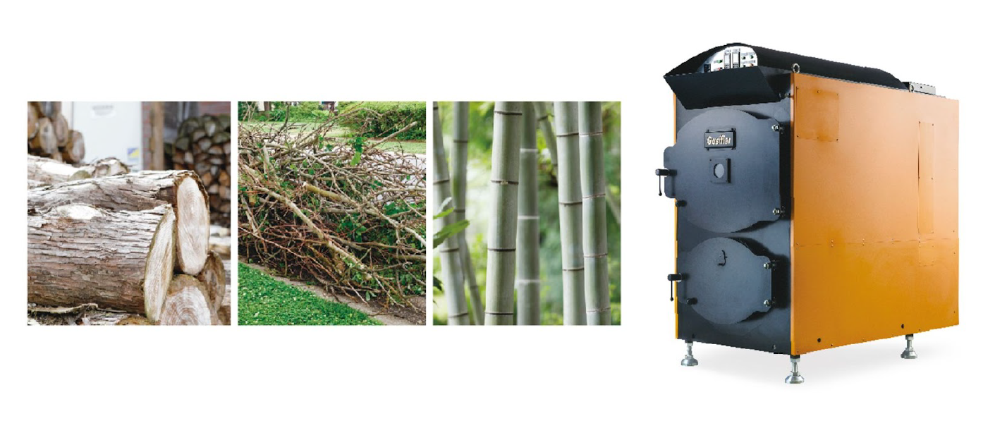 またガシファイアーの特徴は⾼含⽔⽊材の混焼も可能にした⻑い燃焼構造です。⽣⽊が燃焼する