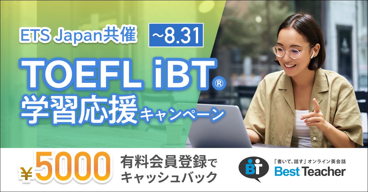 「書いて、話す」オンライン英会話「ベストティーチャー」を運営する株式会社ベストティーチャー(本社:東京都渋谷区、代表取締役社長:高宮敏郎)は、期間限定でTOEFL iBT®受験料が減額されることを背景に、試験対策に取り組む皆さまを応援するため、2024年8月1日(木)より「ETS Japan共催 TOEFL iBT®学習応援キャンペーン」を実施いたします。