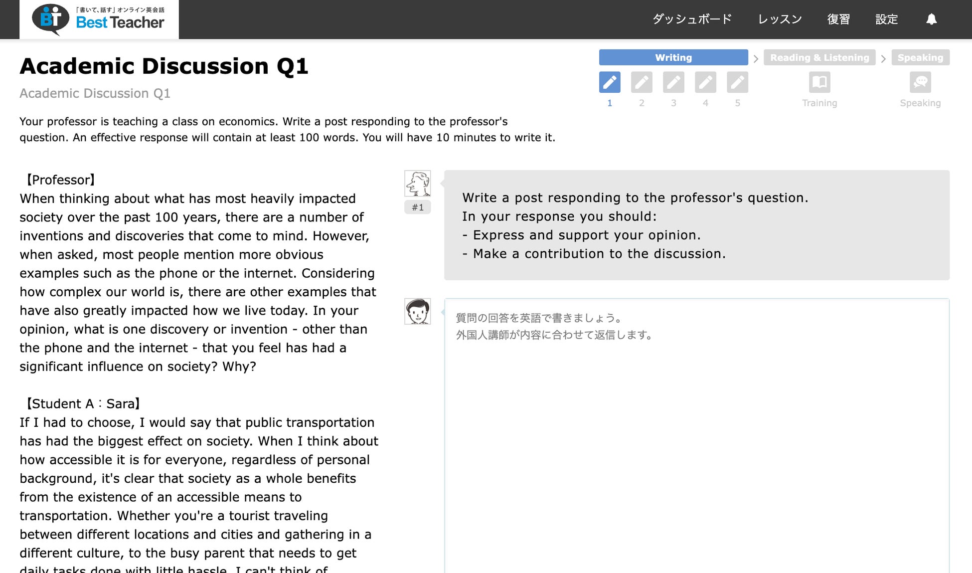 ベストティーチャーは、英語を「書いて、話す」ことを通して習得するオンライン英会話サービスです。まず自分の伝えたいことをライティング(英作文作成)し、添削によって正しい表現を学んだ後、添削を通して作られた「自分だけのオリジナル教材」を使ってスピーキングレッスンを行います。これらの一連の流れを1レッスンとすることで、正確な英語力の習得を目指します。