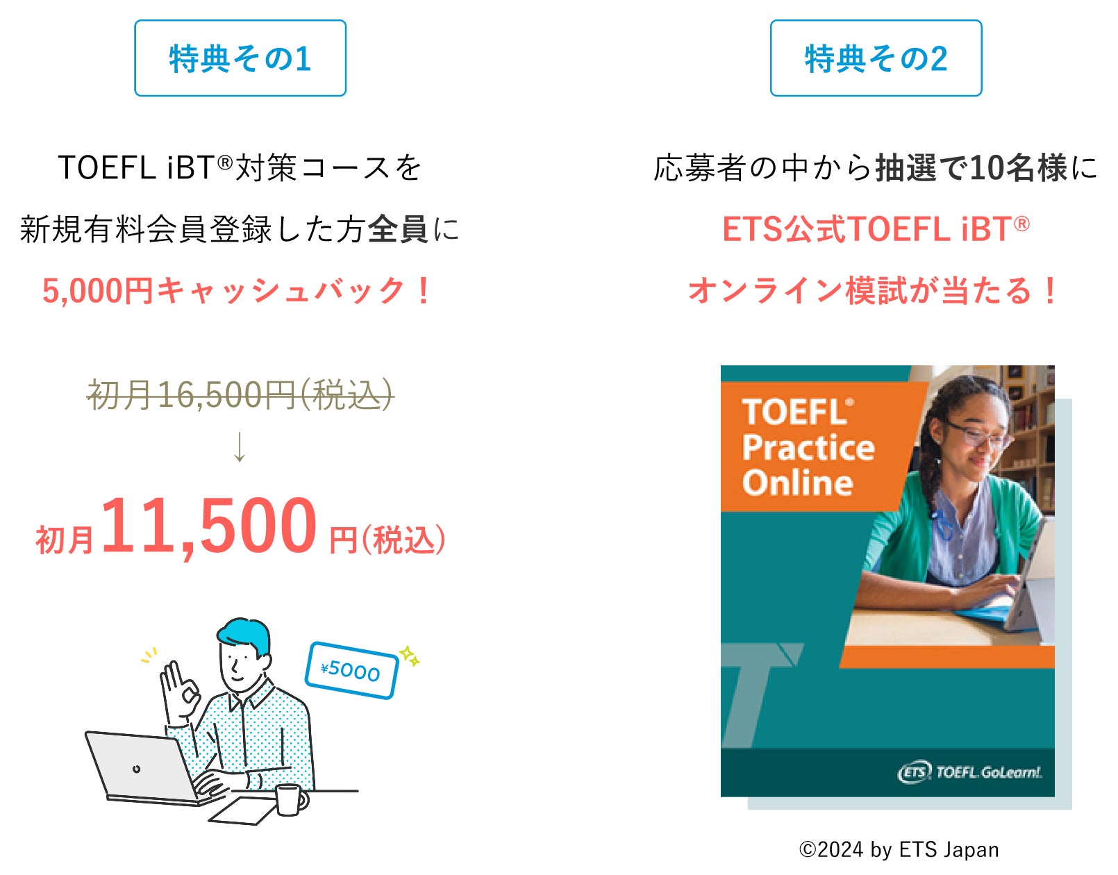 5,000円キャッシュバック & ETS公式TOEFL iBT®オンライン模試プレゼント