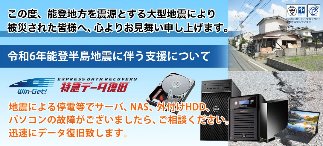 特急データ復旧ウィンゲットは「令和6年能登半島地震により、広範囲で災害・停電が発生したことにおける災害救助支援策のため、データ復旧サービスを20%OFF で提供」