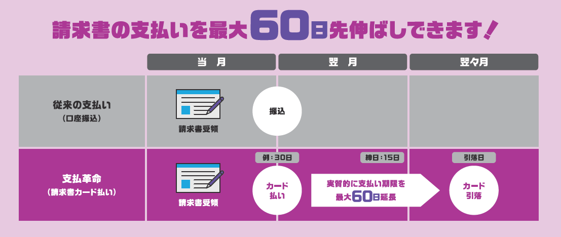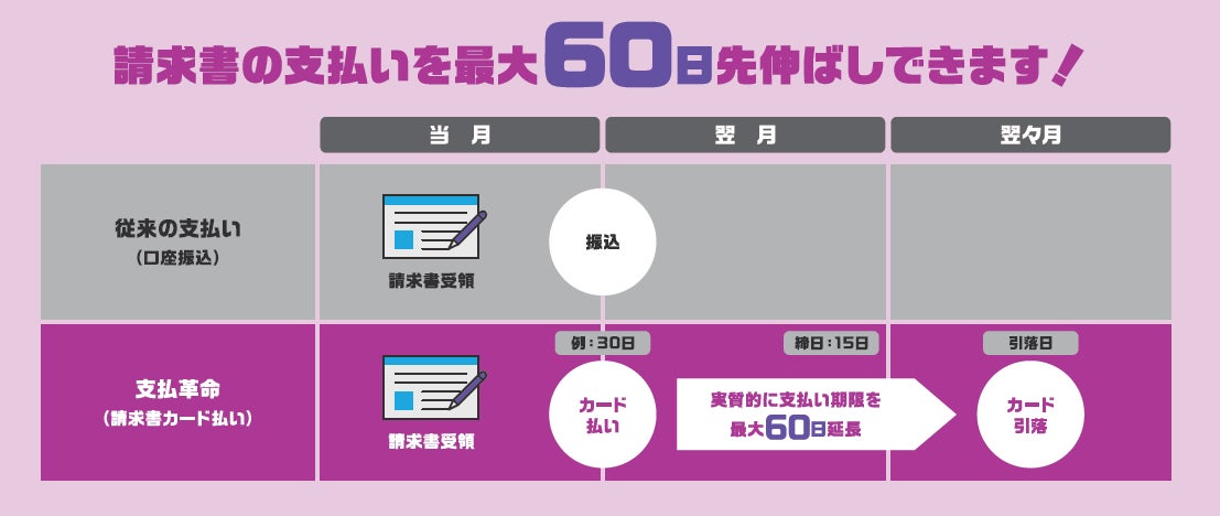 「支払革命(しはらいかくめい)」は、受領した請求書の支払いをクレジットカードで決済できるサービスです。従来の銀行振込と比べ、カード決済を活用することでキャッシュアウトのタイミングを延長でき、資金繰り改善につなげます。