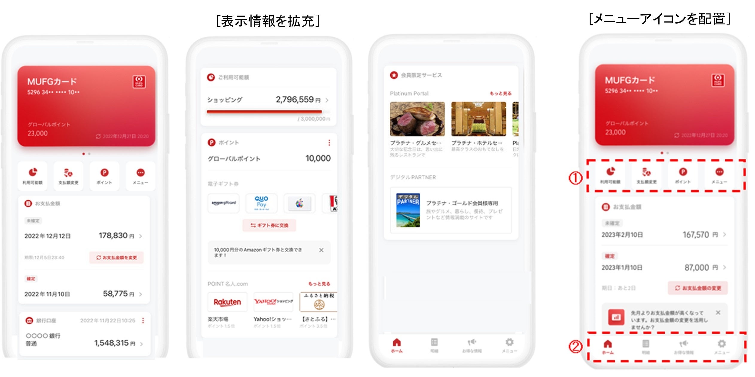 ①従来の特長はそのままに、「銀行口座残高(※1)」や「ご利用可能額」、「ポイント関連情報(※2)」、