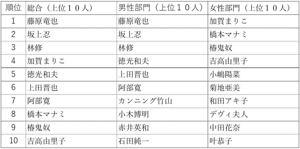 総合第1位に藤原竜也。映画「カイジ」シリーズの主演「伊藤カイジ」を演じ、裏カジノ勝負など人生の逆転を賭けた究極のゲームに挑むさまがそのイメージの要因となった。実際に役作りの為に、パチンコにも通い覚えるほど。