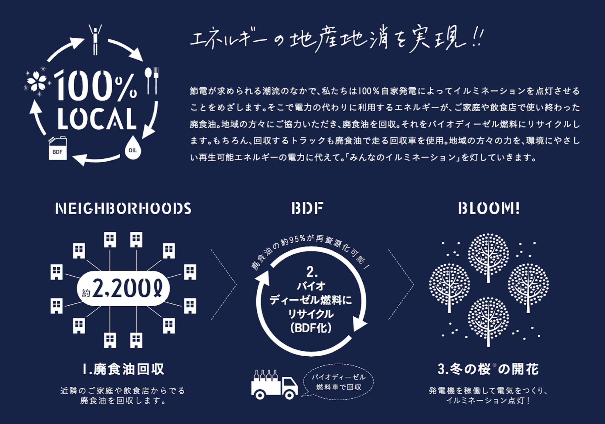 昨今、電力不足による節電が求められる中、『目黒川みんなのイルミネーション』は今年も変わらず、地域のご家庭や飲食店からいただいた廃食油をリサイクルして生まれたエネルギーにより、目黒川沿いに冬の桜®を咲かせます。