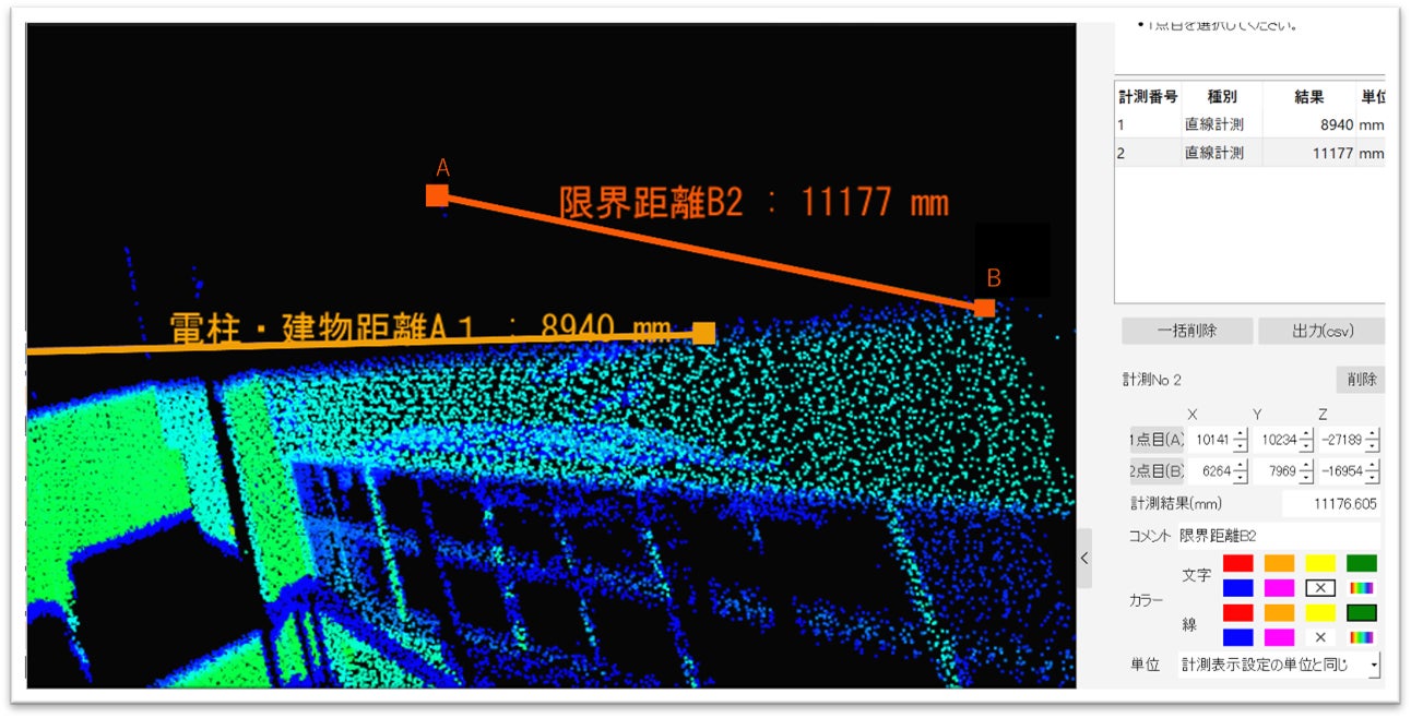 点検作業者が点検・計測した結果に、業務で規定された点検項目名をメモ付けすることができ、計測結果画面上でどの点検項目の結果であるかが一目で分かるようになります。また、項目ごとに表示する色を変えることにより視覚的にも分類がしやすくなり、計測結果をより簡単に管理・確認をすることができます。これらにより、従来は計測結果画面上では直感的に計測対象が分かりにくく、計測した場所の記録に手間がかかっていた点検・計測作業の効率化を支援します。