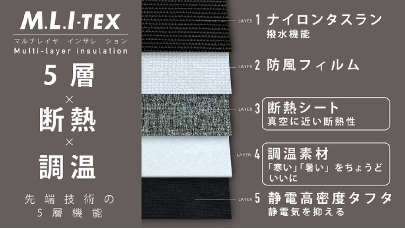 防寒の基本は、防風性と保温性をいかに高めるか。「M.L.I-TEX」素材は、上記5層構造となっており、1着で高い防風性と保温性を発揮します。断熱シートや調温素材をはじめ、NASAの宇宙服にも採用された最先端技術の機能素材をベースに使用しています。(詳細: https://sustainable.bonmax.co.jp/information )