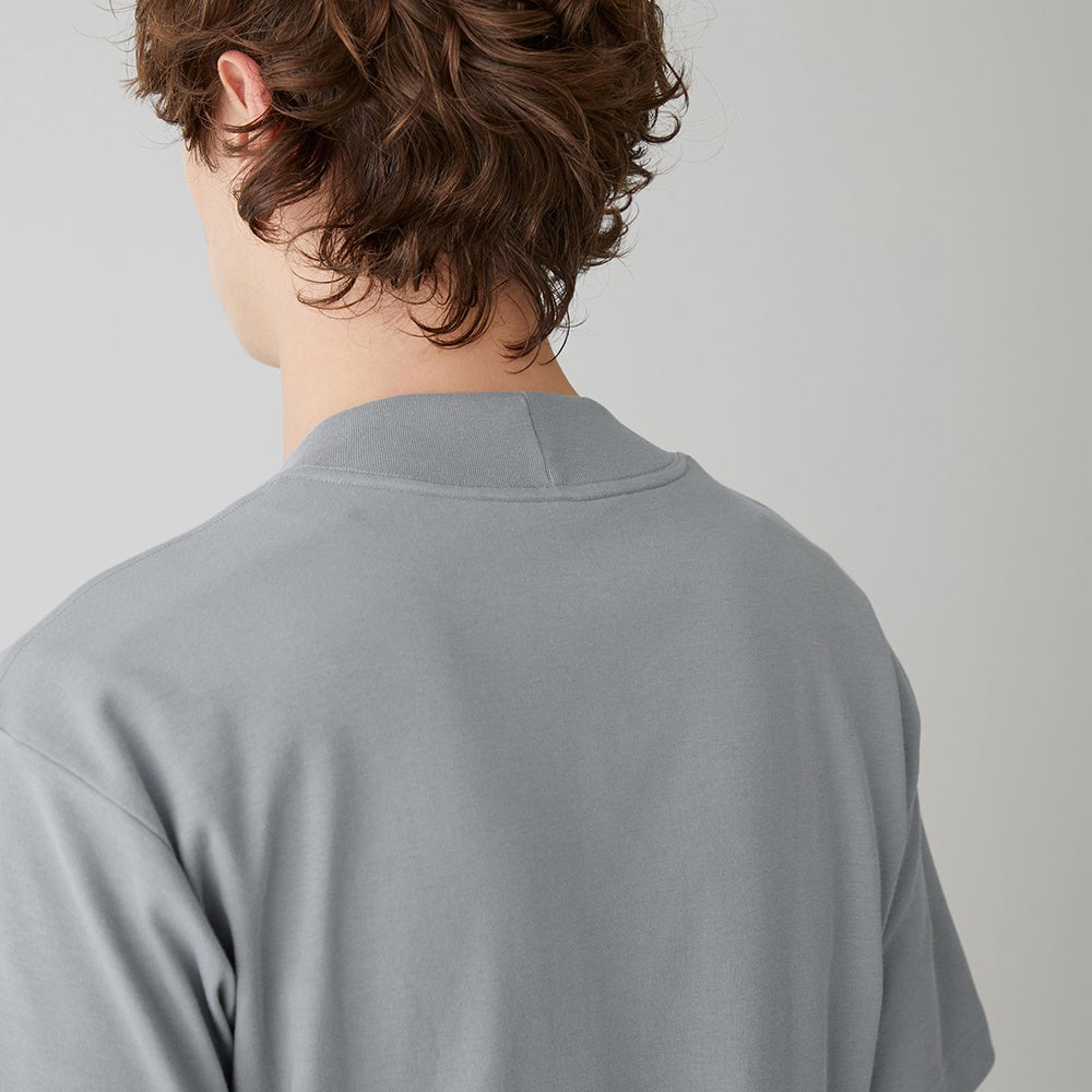 一般的なTシャツよりも首元の後ろのテープを高く設計し、ジャケットの襟裏に汚れがつきにくいパターンにしています。生地は綿100%のスムース編みできめ細やか。上質感のある光沢と滑らかな肌触りに仕上げました。ネックデザインやシルエットが計算しつくされた、ジャケットスタイルにオススメの1枚です。