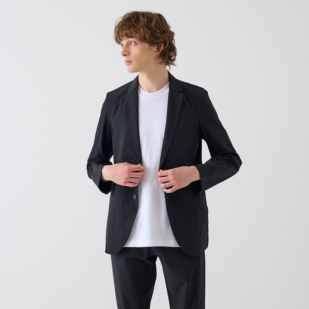 ナイロン素材のテーラードジャケットは軽量で速乾性があり通気性が高いため快適な着心地。しかも、すべてお家で水洗い可能なので、さっぱり着られてお手入れラクチン。同素材のパンツ(BDV151、152、153)と合わせて上下セットアップでも着用可能。